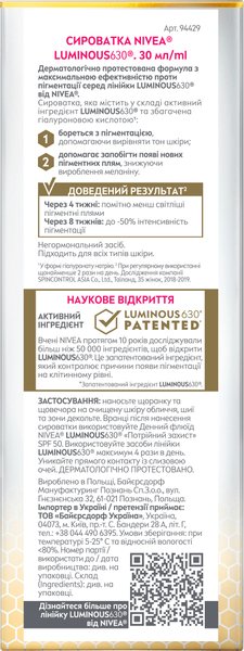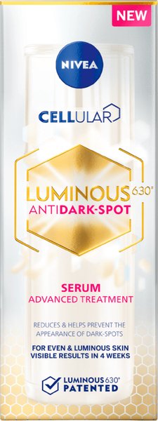 Luminous 630 – это результат 10 лет тщательных исследований. Ученые лаборатории Nivea задались целью воссоздать человеческий фермент, отвечающий за выработку пигмента меланина. Для достижения этой цели было протестировано более 50 000 молекул в различных сочетаниях. И активный ингредиент №630 продемонстрировал наилучший результат в сбалансировании выработки меланина кожей, а следовательно, в уменьшении проявления пигментных пятен.
