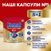 Капсулы Somat exellence 5-в-1 - это быстрорастворимые капсулы, состоящие из порошка и четырех уникальных гелей в водорастворимой пленке. Мощная формула капсул обеспечивает глубокое очищение засохшей грязи и яркий блеск. Она деликатна к посуде и заботится о посудомоечной машине. Также благодаря уникальной формуле капсул Вы можете забыть о появлении пятен на посуде и следах капель воды, наслаждаясь блеском чистой посуды сразу после окончания цикла мытья.