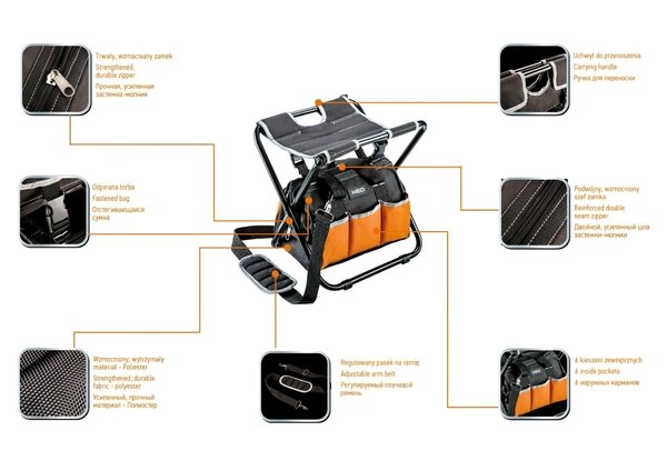 Табурет складной с сумкой для инструмента NEO материал - твердый полиэстер 600 D, гарантирующий прочность на долгие годы. Табурет с отстегивающейся сумкой пригодится при выполнении работ в самых тяжелых условиях. Табурет с регулируемым плечевым ремнем и ручкой для комфортной транспортировки. Сумка кроме основного отдела имеет 6 наружных карманов для инструмента. Бренд NEO оправдывает ожидания профессионалов.