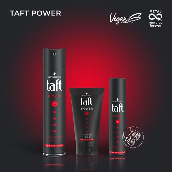 Твоя сила – в твоем стиле. Создавай образы, соответствующие любому настроению и чувствуй себя уверенной в каждом из них. Позаботься об устойчивой укладке с серией средств Taft «Power» с кофеином. Специальная vegan формула обеспечит надежную фиксацию до 72 часов, укрепление волос от корней до кончиков и никакого утяжеления.