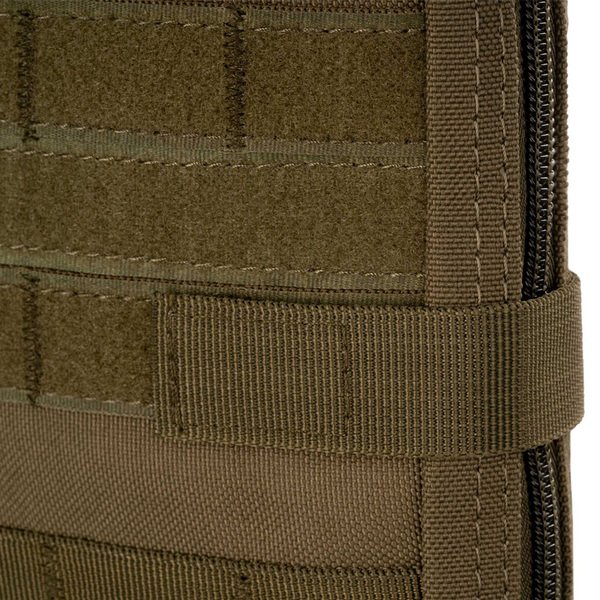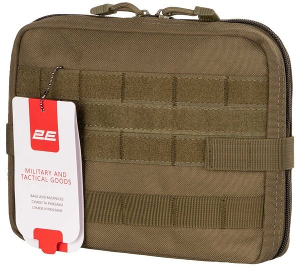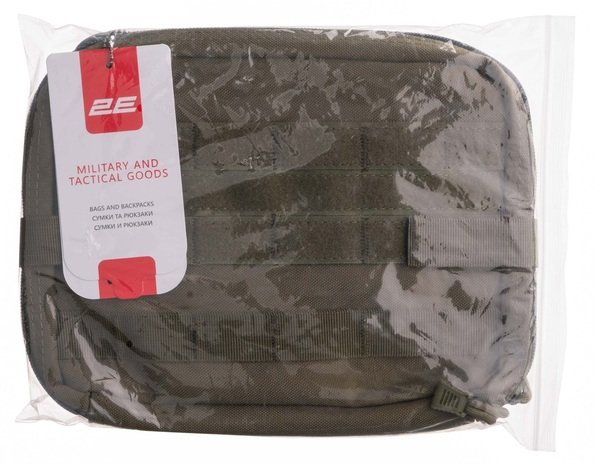 Органайзер имеет вес 300 г и внутренний объем 2 л. Сумка изготовлена из полиэстера, она прочная, долговечная и имеет эргономичный дизайн. Модель имеет два основных отделения: одно на молнии, другое - без застежки. В центральном отделении на обеих стенках вшиты эластичные держатели для мелких вещей. Для удобства есть возможность регулировать ширину развертывания органайзера за счет эластичной веревки с застежкой. Особенностью органайзера 2E является продуманная конструкция, в частности, большое количество креплений, что позволяет разместить подсумок на бронежилете, рюкзаке или использовать его с плечевым ремнем (не входит в комплект). На задней панели пришиты две пластиковые петли для крепления ремня. Также, на этой же тыльной стороне предусмотрены четыре горизонтальные стропы molle и четыре дополнительные вертикальные застежки на кнопках (съемные). На передней панели органайзера, кроме поверхности для размещения шевронов и т.д. (липучки), есть еще три фастекса. По бокам подсумок дополнительно закрывается двумя застежками.
