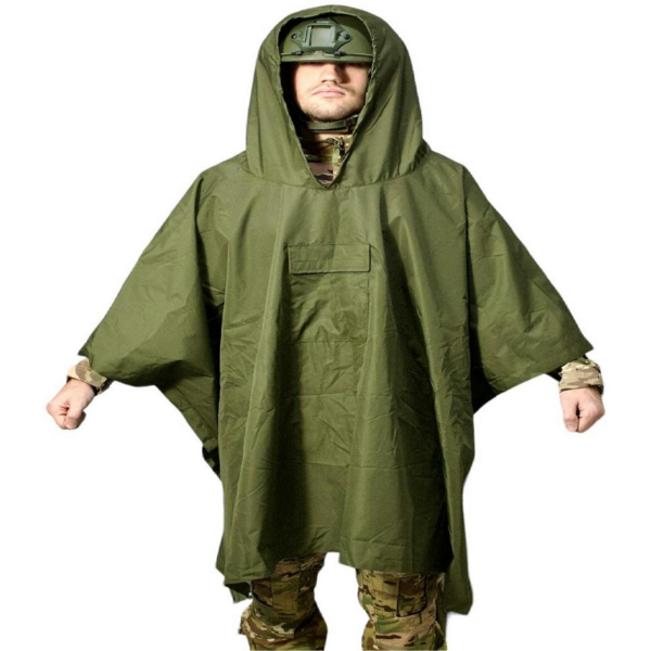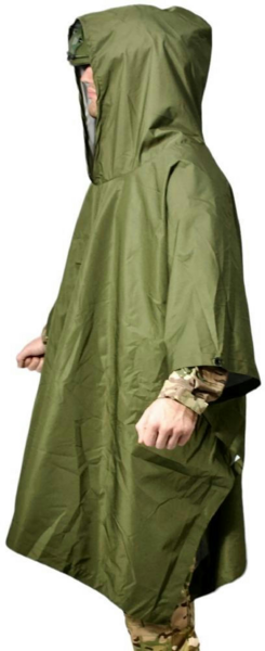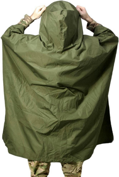 Представленный плащ-палатка имеет широкий глубокий капюшон, полностью покрывает голову со шлемом. Для более комфортного использования на капюшоне предусмотрены прорезиненные жгуты с фиксаторами. Дождевик имеет укрепленные люверсы на краях, поэтому его можно растянуть и сделать укрытие от солнца или дождя или использовать для транспортировки человека, получившего ранения. Благодаря мягкой текстуре материала дождевик можно легко и компактно сложить. Имеет фиксацию на кнопки, на которые можно застегнуть дождевик с обеих сторон.