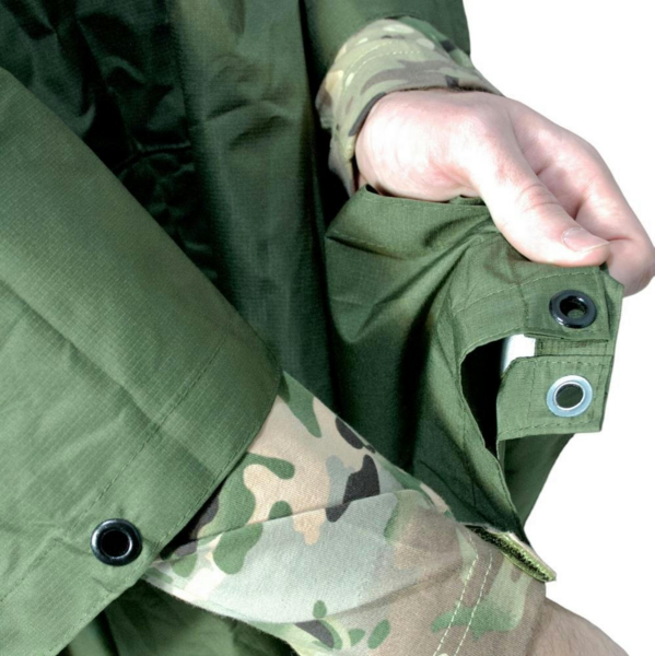 Внутри имеет специальную проклейку швов и резиновый слой на самой ткани. Изделие надежно защищает не только тело бойца, а и его экипировку и снаряжение, в частности оружие, рюкзак и пр. Благодаря широкому крою абсолютно не сковывает движений, обеспечивает быстрый переход в позицию ведения огня.