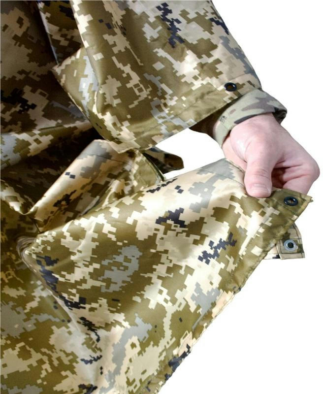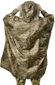 Внутри имеет специальную проклейку швов и резиновый слой на самой ткани. Изделие надежно защищает не только тело бойца, а и его экипировку и снаряжение, в частности оружие, рюкзак и пр. Благодаря широкому крою абсолютно не сковывает движений, обеспечивает быстрый переход в позицию ведения огня.