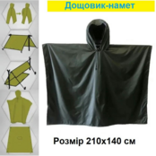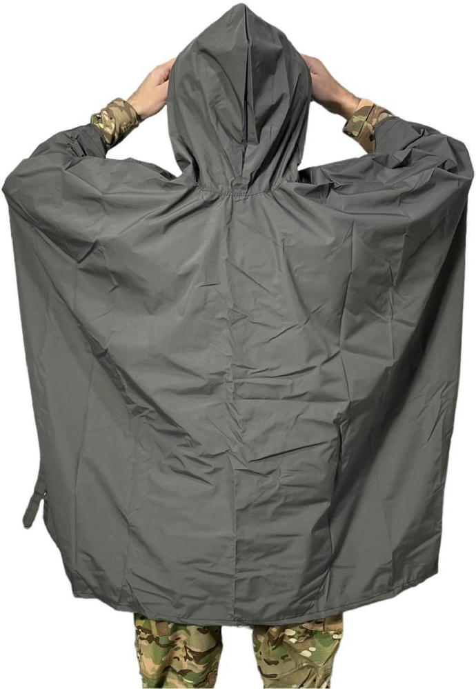 Представленный плащ-палатка имеет широкий глубокий капюшон, полностью покрывает голову со шлемом. Для более комфортного использования на капюшоне предусмотрены прорезиненные жгуты с фиксаторами. Дождевик имеет укрепленные люверсы на краях, поэтому его можно растянуть и сделать укрытие от солнца или дождя или использовать для транспортировки человека, получившего ранения. Благодаря мягкой текстуре материала дождевик можно легко и компактно сложить. Имеет фиксацию на кнопки, на которые можно застегнуть дождевик с обеих сторон.