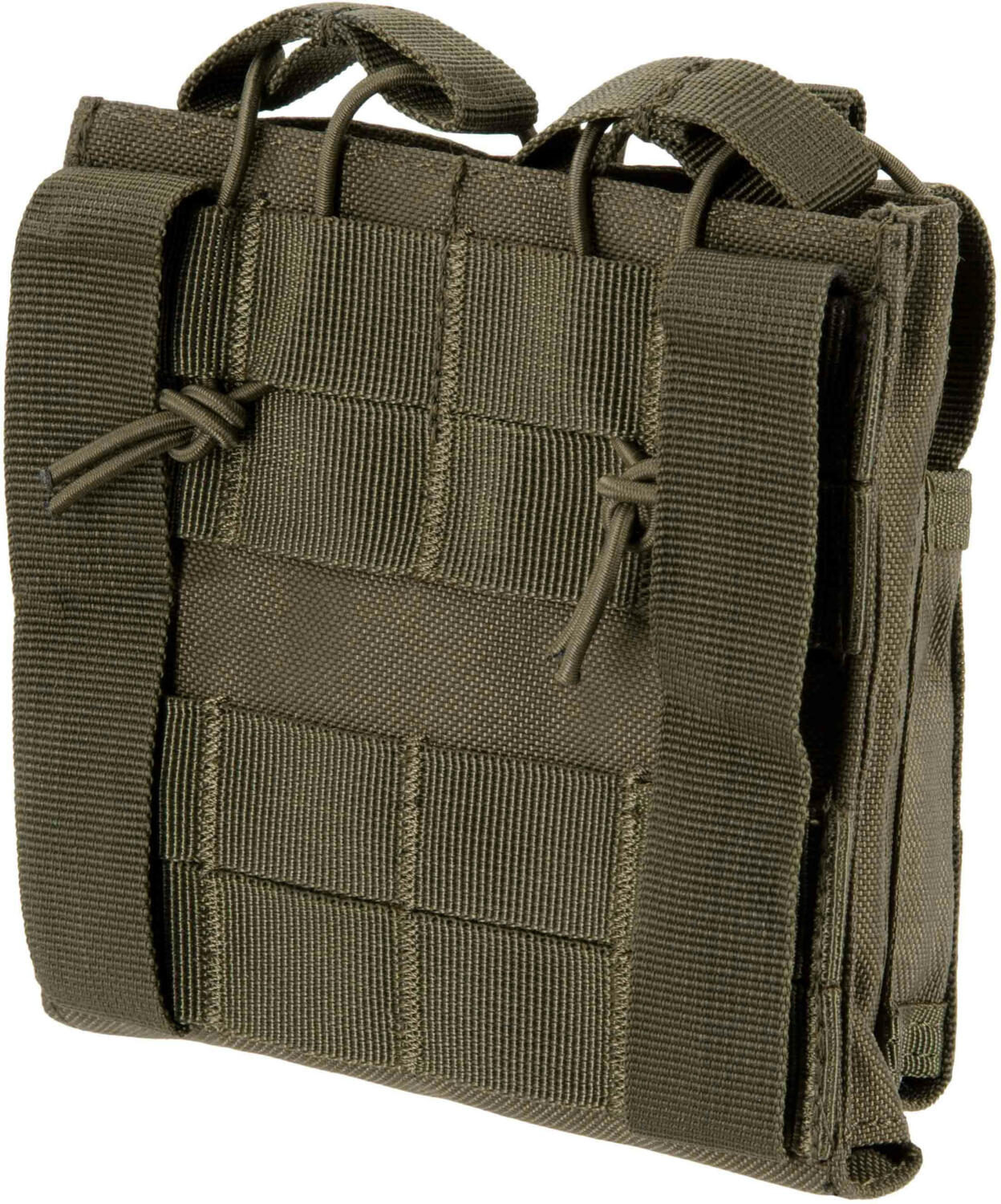 Подсумков с дополнительным кармашком для двух магазинов в комплекте аж два, следовательно, суммарно для четырех магазинов. Размер подсумка – 15х15 см, размер дополнительного кармашка для магазина составляет 5×9,5×3 см. Крепится к ремню двумя стропами MOLLE.