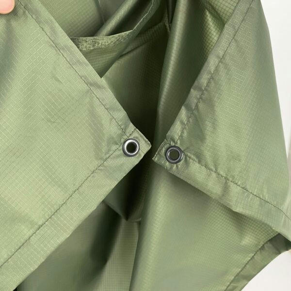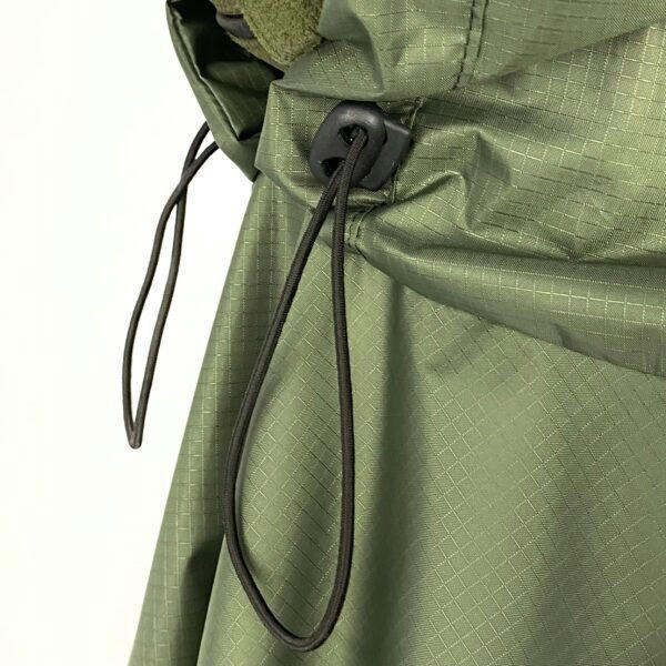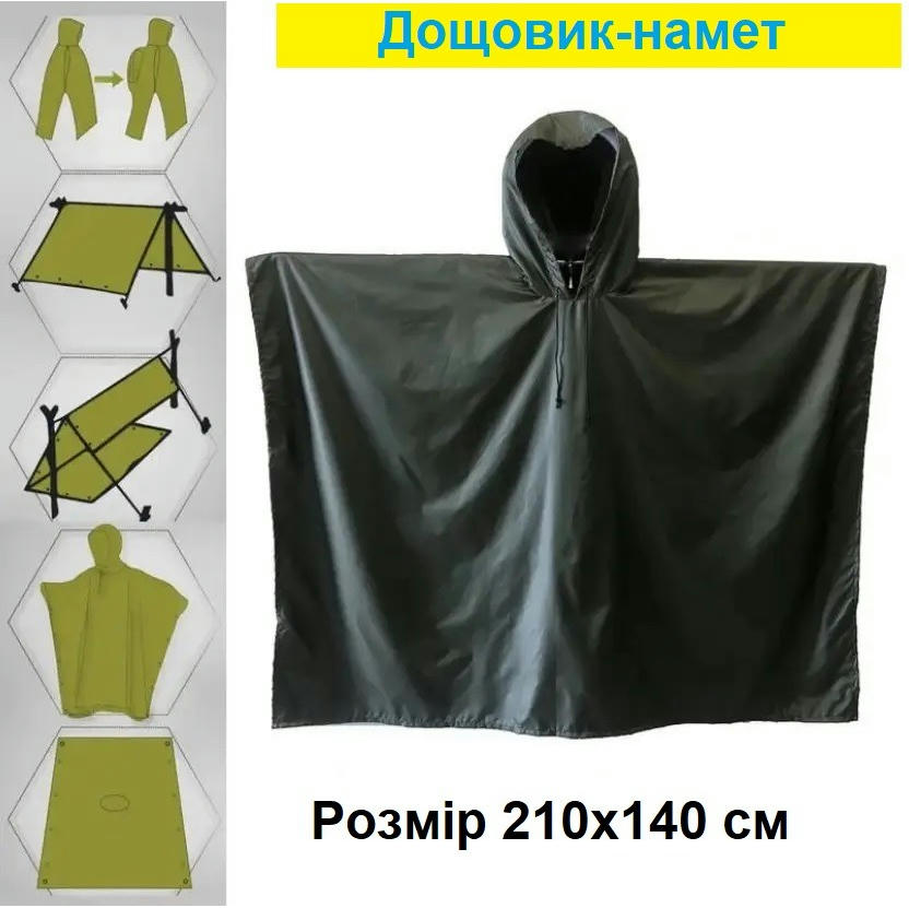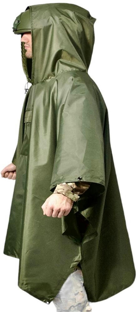 Представленный плащ-палатка имеет широкий глубокий капюшон, полностью покрывает голову со шлемом. Для более комфортного использования на капюшоне предусмотрены прорезиненные жгуты с фиксаторами. Дождевик имеет укрепленные люверсы на краях, поэтому его можно растянуть и сделать укрытие от солнца или дождя или использовать для транспортировки человека, получившего ранения. Благодаря мягкой текстуре материала дождевик можно легко и компактно сложить. Имеет фиксацию на кнопки, на которые можно застегнуть дождевик с обеих сторон.