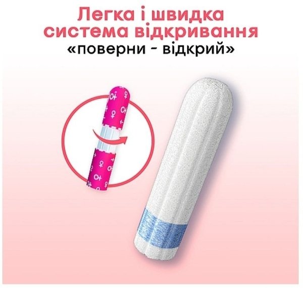 Благодаря поверхности SilkyCover гарантируется максимально комфортное введение, а гидрофильные волокна UltraSorb быстро впитывают влагу. Специальная голубая зона состоит из суперпвпитывающих волокон UltraSorb, она быстро впитывает влагу, удерживает ее внутри и обеспечивает надежную защиту от протеканий. Уникальная система открытия "прокрути и открой" позволяет использовать тампоны Kotex в любых условиях.