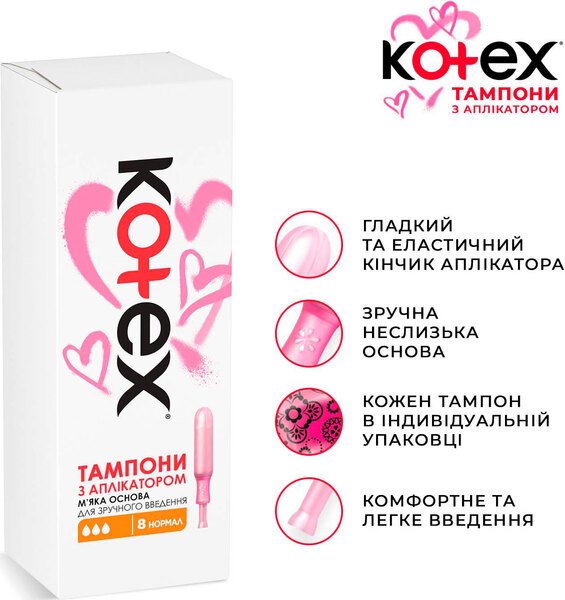 Тампоны Kotex с аппликатором — новый уровень комфорта! Наличие удобного аппликатора с ультрагладким кончиком и нескользящим основанием обеспечивает легкое, комфортное, гигиеничное введение тампона и его правильное размещение внутри тела.