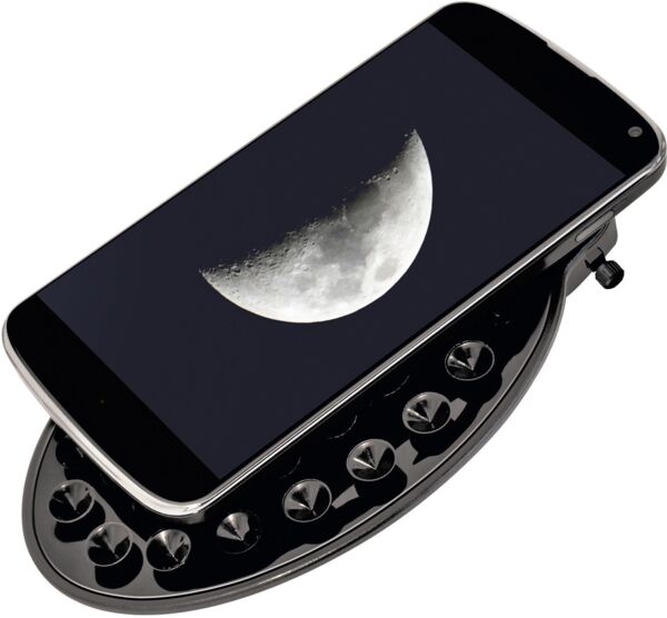 Набор аксессуаров облегчит наблюдения и сделает их интересными и подробными. В комплектацию входит адаптер для смартфона (планшета). Адаптер крепится на выбранном окуляре и позволяет проводить фото и видеосъемку главной или передней камерой гаджета. Гладкая тыльная сторона смартфона надежно крепится с помощью множества присосок адаптера (в случае рифленой тыльной поверхности смартфона рекомендуется использовать переднюю камеру).