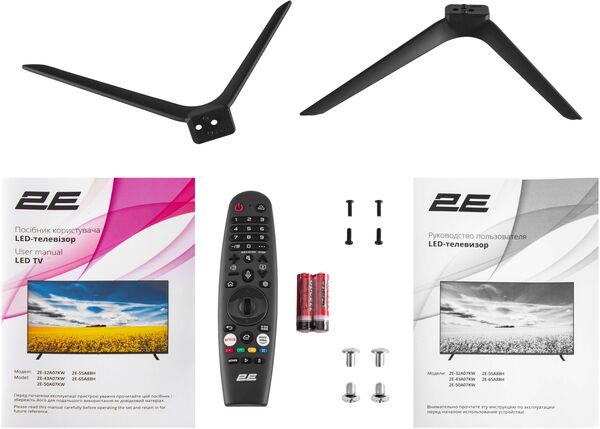 | Комплектация (возможны изменения в разных поставках) | Документация, Кабель питания, Подставка, Пульт ДУ, Телевизор |