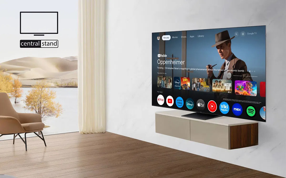 Телевизор оснащен обтекаемой металлической подставкой по центру, благодаря чему этот телевизор с большим экраном можно легко разместить на любой поверхности в доме. Функциональная элегантность сочетается с высокой производительностью, создавая идеальную гармонию.