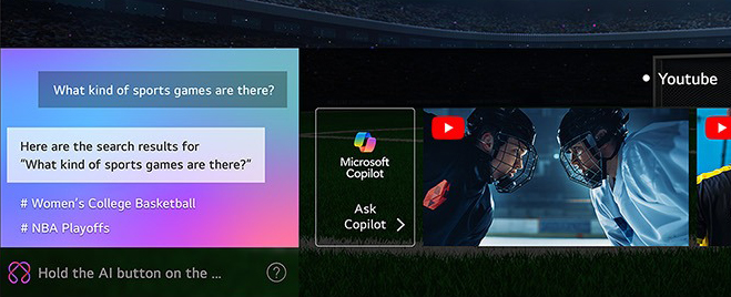 Спросите у своего телевизора что угодно. Встроенный искусственный интеллект распознает ваш голос и быстро предоставляет персонализированные рекомендации по вашим запросам. Вы также можете получить дополнительные результаты и решения с помощью Microsoft Copilot.