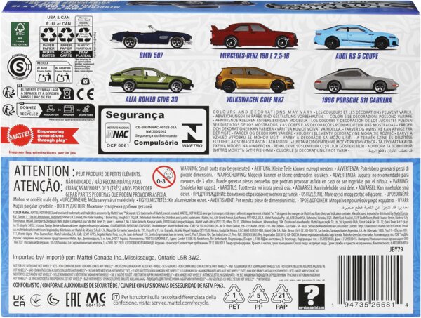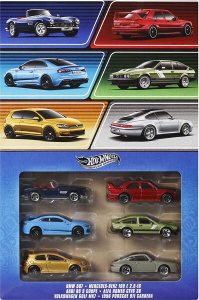 Подарочный набор автомобилей обязательно придется по душе юному поклоннику скорости и адреналина. В набор входит 6 классических машинок ярких цветов. Все модели вдохновлены известными европейскими автопроизводителями – Alfa Romeo, BMW, Volkswagen, Porsche, Audi и Mercedes-Benz – и имеют повышенный уровень детализации: с проработкой передней и задней частей для большей привлекательности среди коллекционеров. Скоростные, яркие, надежные, выносливые, на любой вкус. Играйте, создавая свой мир соревнований! Коллекционируйте без ограничений! Машинки также разработаны под игровые треки Hot Wheels, имеют металлический корпус и изготовлены в масштабе 1 к 64.