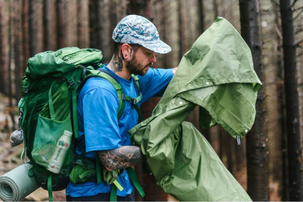 Многофункциональное пончо Molfar от украинского бренда Turbat разработано, чтобы защищать путешественников в путешествиях во время непогоды. Его можно использовать как плащ, надевая поверх рюкзака, а можно - как тент. Легче всего трансформировать пончо в убежище для ночлега или временного накрытия, если у вас есть треккинговые палки.