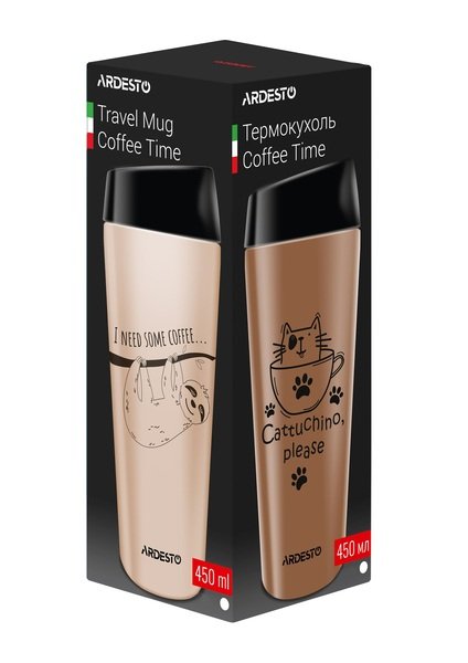 Термочашка на 450 мл с вакуумной технологией сохранения температуры — до 8 часов для горячих напитков, и 12 часов для холодных. Внешняя металлическая часть окрашена в бежевый цвет с матовой текстурой и рисунком ленивца на ветке. Внутренняя часть выполнена из нержавеющей стали 18/10. Нескользящая основа предотвращает переворачивание, а пластиковая крышка получила силиконовую прокладку и кнопку открытия отверстия для питья.
