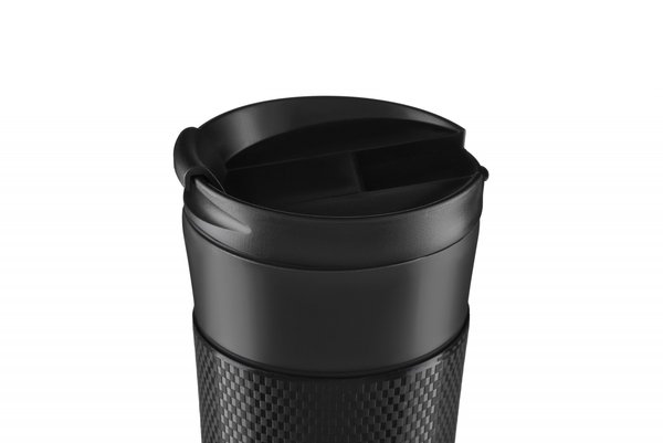 Термочашка на 450 мл с вакуумной технологией хранения температуры — до 8 часов для горячих напитков, и 12 часов для холодных. Внешняя металлическая часть окрашена в черный цвет с матовой текстурой. Для удобства предусмотрено силиконовое покрытие под ладонь. Внутренняя часть выполнена из нержавеющей стали 18/10. Нескользящая основа предотвращает переворачивание, а пластиковая крышка получила силиконовую прокладку и откидную крышку.