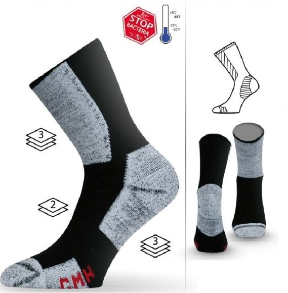 Lasting CMH – плотные теплые носки для трекинга, выполненные из двухслойного плюша и полипропиленовых нитей, содержащие ионы серебра, замедляющие рост бактерий и грибков, уменьшающие неприятные запахи и поддерживающие надлежащий баланс кожи. Носки обеспечивают лучшую теплоизоляцию и защищают от натирки. Дополнительные зоны защиты расположены вокруг голени и икры. Зоны носка и пятки уплотнены гладким трехслойным плюшем, что обеспечивает комфорт при ходьбе, а также прочность областей с наибольшей нагрузкой. Лучше всего подойдут для ношения в холодное время года (осень, зима).
