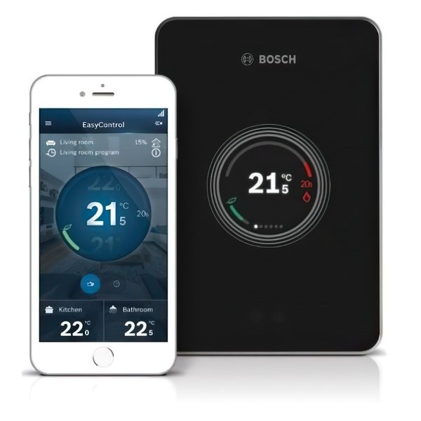EasyControl CT 200 В это комнатный термостат для управления отопительной системой с учетом температуры помещения или погодозависимого управления с возможностью удаленного доступа через интернет. Стильный дизайн сенсорного экрана с чёрной стеклянной поверхностью идеально сочетающейся с дизайном новейших моделей конденсационных котлов Bosch. Доступна функция автоматического определения присутствия пользователей дома по данным геолокации смартфона или датчикам приближения устройства; функция «Самообучение» для управления системой отопления и горячего водоснабжения на основании индивидуальных привычек пользователя; возможность погодозависимого управления и контуром горячего водоснабжения без датчика внешней температуры благодаря получению прогноза погода через интернет; настройка индивидуальных программ для контура отопления и горячего водоснабжения; графики изменения наружной температуры , отопительных кривых, расхода и стоимости энергоносителей.