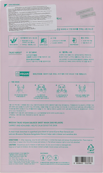 Тканевая маска для лица Missha Talk Vegan Squeeze Sos Relaxer экстренное восстановление 27г