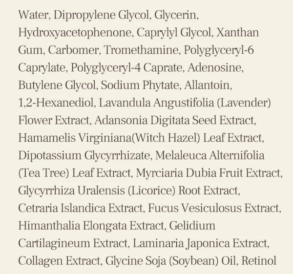 | Состав | Water, Dipropylene Glycol, Glycerin, Hydroxyacetophenone, Caprylyl Glycol, Xanthan Gum, Carbomer, Tromethamine, Polyglyceryl-6 Caprylate, Polyglyceryl-4 Caprate, Adenosine, Butylene Glycol, Sodium Phytate, Allantoin, 1,2-Hexanediol, Lavandula Angustifolia (Lavender) Flower Extract, Adansonia Digitata Seed Extract, Hamamelis Virginiana (Witch Hazel) Leaf Extract, Dipotassium Glycyrrhizate, Melaleuca Alternifolia (Tea Tree) Leaf Extract, Myrciaria Dubia Fruit Extract, Glycyrrhiza Uralensis (Licor |