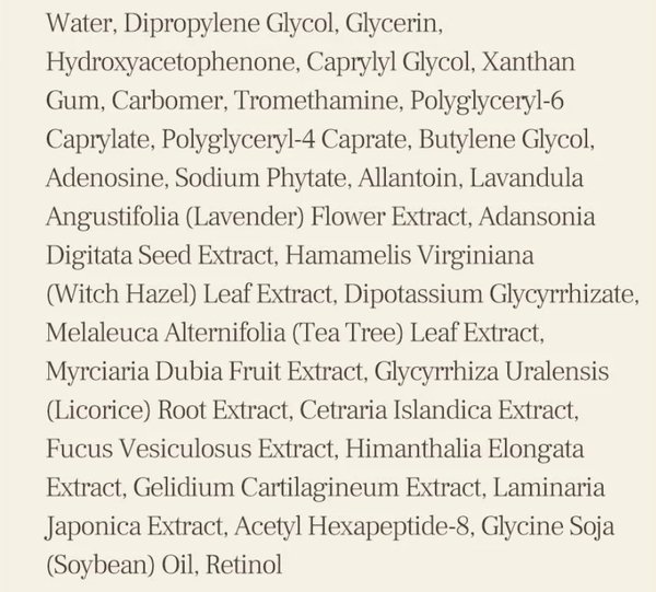 | Состав | Water, dipropylene glycol, glycerin, hydroxyacetophenone, caprylyl glycol, xanthan gum, carbomer, tromethamine, polyglyceryl-6 caprylate, polyglyceryl-4 caprate, butylene glycol, adenosine, sodium phytate, allantoin, lavender flower extract, baobab seed, leaf extract (witch hazel), glycyrrhizate dipotassium, leaf extract (tea tree), murciaria fruit extract, root extract (licorice), cetraria extract, fucus extract, seaweed extract, Japanese kelp extract, collagen, glycine-soybean (soybean) oil, |