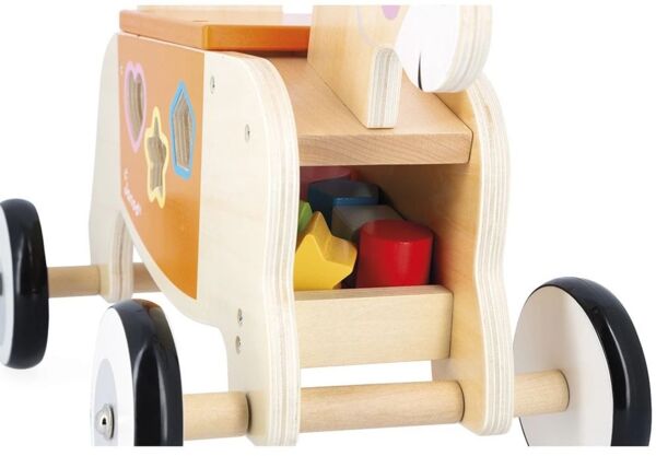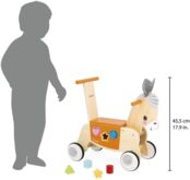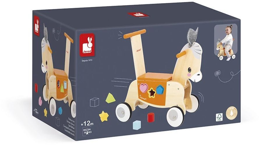 Маленькому ослу не терпится открыть для себя мир, равно как и малышу! С этой деревянной тележкой для осла вы можете отправляться навстречу новым приключениям, начиная с 12 месяцев. Ну-ка, ишак! Катаясь на коляске, малыш развивает чувство равновесия и общую моторику, а также познает окружающий мир. Хочешь толкать свою игрушку или чтобы тебя толкали? Благодаря ручке на спинке! Как бы ваш малыш не использовал свою коляску, он научится управлять своим весом и прекрасно проведет время. Чуть больше этой игрушки для раннего развития? В комплект входит коробка с 6 фигурками, которые можно вставлять и вытаскивать спереди, чтобы начать все сначала. Идеально подходит для тренировки ловкости! И последнее, но не менее важное: 4 резиновых колеса бесшумны и обеспечивают хорошее сцепление с поверхностью, поэтому вы можете спокойно ходить с игрушкой. Идеально подходит для развития общей моторики и укрепления опоры при ходьбе, эта деревянная тележка привлекает внимание своими маленькими фетровыми ушками и мягкими цветами. Независимо от того, любит ли ваш малыш сельскохозяйственных животных или просто бегать рысью, он будет в восторге! Эта игрушка для раннего развития изготовлена из древесины, сертифицированной FSC, из лесов с устойчивым управлением.