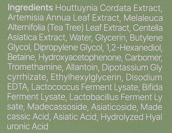 - Комплекс 5 CICA (экстракт центеллы азиатской, мадекасосид, мадекасовая кислота, азиатикозид, азиатиковая кислота) — обладает выраженным заживляющим и успокаивающим действием, разглаживает и смягчает кожу, устраняет покраснения и шелушения, борется с куперозом, укрепляет капилляры, питает и усиливает защитный гидролипидный барьер, поддерживает упругость и плотность кожи.