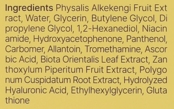 - Экстракт физалиса (36,8%) — выравнивает тон кожи, подавляет образование меланина (в том числе из-за солнечного излучения или гормонального стресса), регулирует внутрикожную температуру, защищает от инфракрасных лучей и видимого света. Способствует увеличению выработки коллагена I и GAG, стимулирует обновление клеток, борется с фотостарением и придает коже естественное сияние.