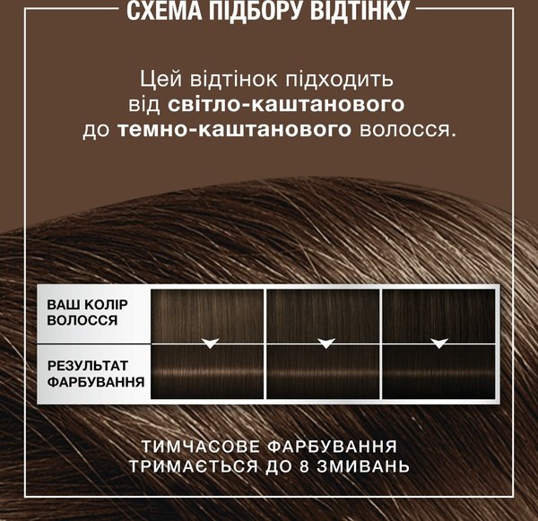 - Насыщенный каштановый оттенок бальзама подходит для оттенков волос от светло-каштановых до темно-каштановых
