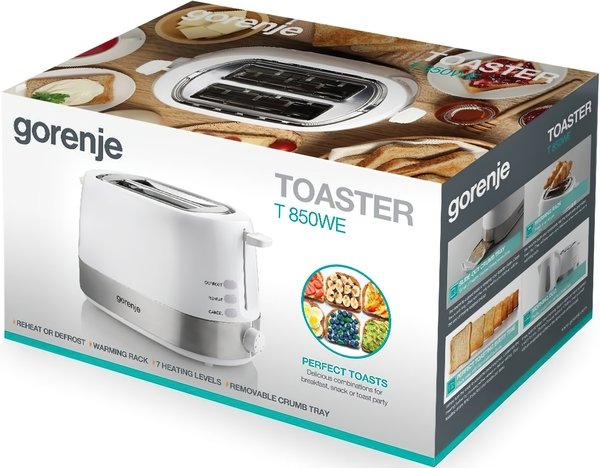 Тостер GORENJE T850WE оснащен 2 отделениями под тосты и имеет 7 режимов обжаривания. Он позволяет за короткое время приготовить любимые хрустящие тосты.