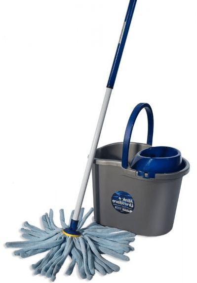 - Веревочная с отжимом или без него. Представляет собой ручку, на которую одевается насадка с веревками. Последняя изготавливается из разных материалов. Чаще всего это микрофибра. Недостаток таких приспособлений — то, что они оставляют разводы, а из веревок могут выспаться ворсинки. Не рекомендуется использовать швабры для мытья ламинатов, так как насадку невозможно отжать насухо. Для прибора с отжимом нужно приобрести специальное ведро.