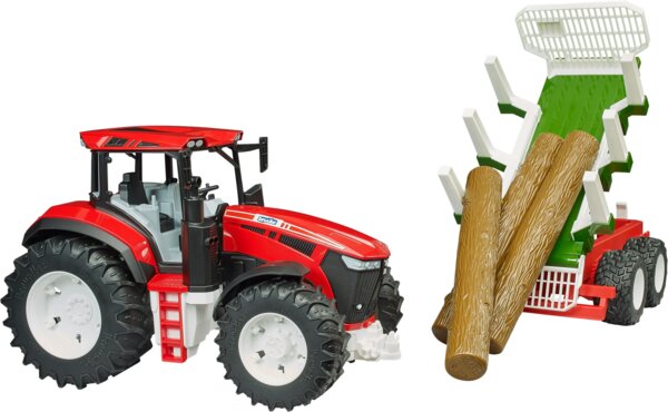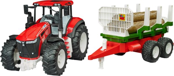 Модель отличается детализированной кабиной и большими шинами с характерным тракторным протектором, обеспечивающими уверенную езду на различных поверхностях. В набор также входят прицеп и три бревна.