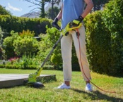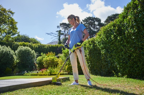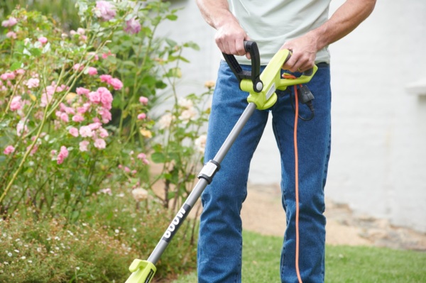 Садовый триммер оснащен электрическим двигателем мощностью 600 Вт и шириной скашивания 30 см.