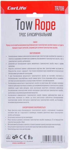 Трос буксировочный CarLife — это доступный выбор отличного качества, который поможет вам в трудную минуту. Предназначен для буксирования грузов с весом до 3 тонн. Буксировочный трос представляет собой прочную ленту длиной 4 метров и шириной 4,5 см с двумя крюками по краям, для обеспечения простой и надежной фиксации. Лента выполнена из прочного материала легкого в уходе и хранении.