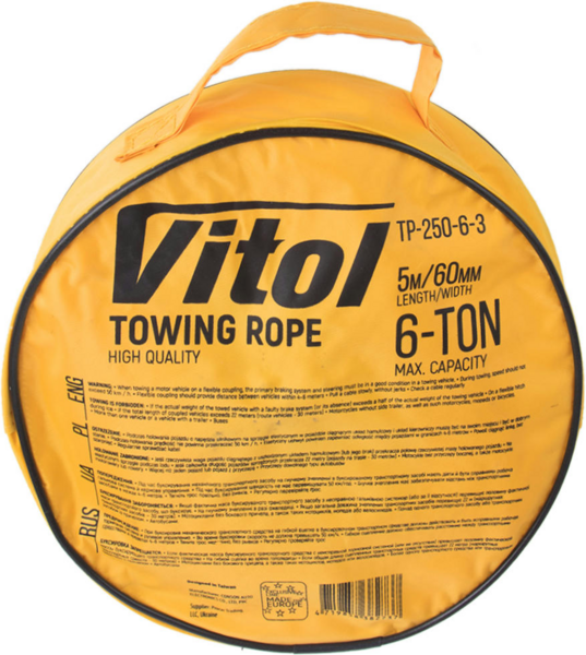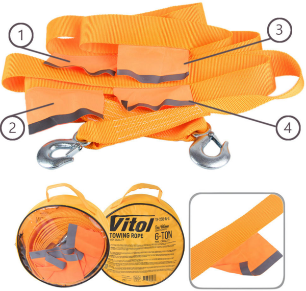 - Трос буксировочный Vitol 6т 60мм * 5м 2 крюка Оранжевый (ТР-250-6-3)
