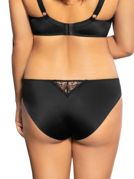 - Передняя часть трусиков гладкая, спинка украшена треугольной вставкой из кружева;