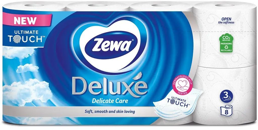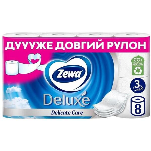 Туалетная бумага Zewa Deluxe — гигиеническое средство, которое достойно внимания самых взыскательных потребителей. Delicate Care — удивительное сочетание качества и комфорта. Трехслойный материал (сертифицированная целлюлоза) создан по особой технологии, благодаря тиснению и специальным впитывающим «подушечкам» обеспечивает деликатное очищение и в то же время заботится о коже.