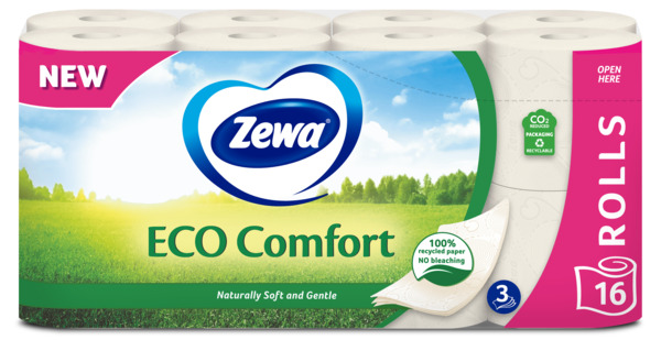 Новая туалетная бумага Zewa Eco Comfort изготовлена из 100% переработанной бумаги без отбеливания хлором и добавления ароматизаторов. Это идеальный выбор для тех, кто заботится о качестве и защите окружающей среды. Туалетная бумага Zewa Eco Comfort такая же прочная и впитывающая бумага, как и другие в ассортименте Zewa.