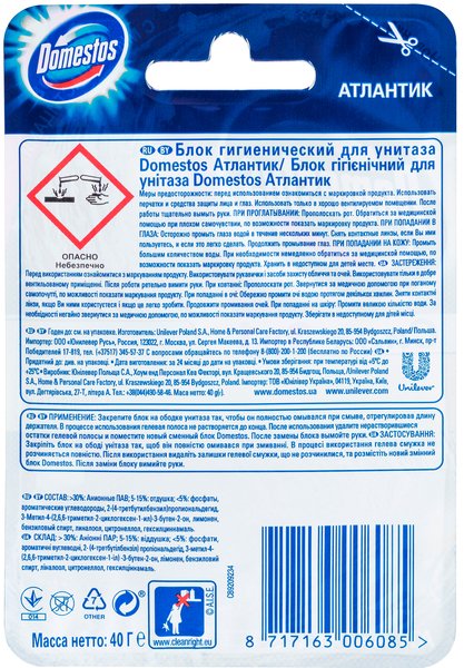 - Domestos 3 в 1: устраняет источник бактерий, предотвращает появление известкового налета, с парфюмированной гелевой полоской