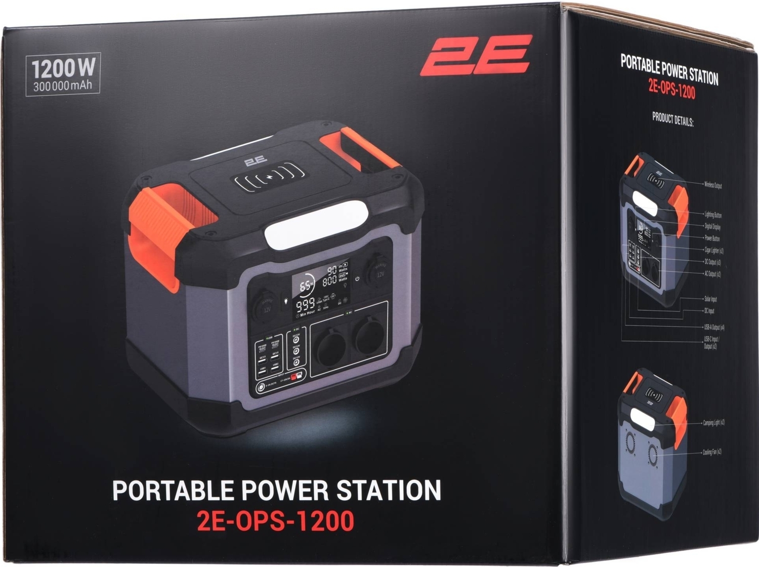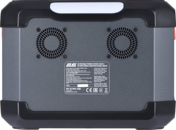 Портативна електростанція 2E 1200W важить 11,6 кг при габаритах 338×247×245 мм. У такому порівняно компактному, як для такої потужності, корпусі вміщається неабияка потужність. Ємність літієвого акумулятора становить 300000 мАг при потужності 1200 Вт, пікова потужність становить 2400 Вт (1 с). Перевантаження відбувається при 1300 Вт протягом 10 секунд. Рукоятка цієї моделі не єдина, а розділена на дві окремі, розташовані з боків станції для більш зручного транспортування.