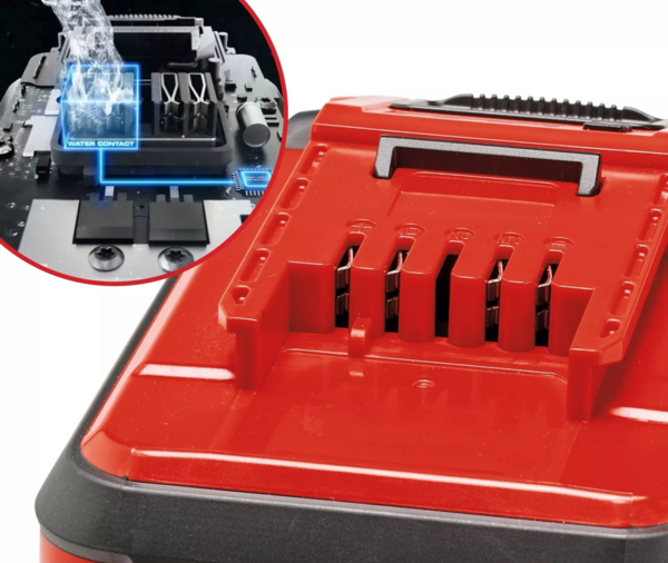 Завдяки системі захисту від короткого замикання через додатковий контакт на розетці акумулятора, датчики виявляють контакт із водою й автоматично вимикають електроніку. Таким чином, батарея не постраждає і може бути використана знову, як тільки повністю висохне.