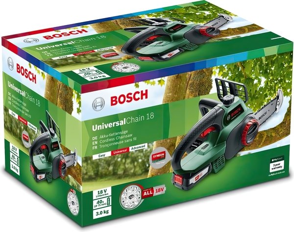 Високопродуктивна ланцюгова пилка Bosch UniversalChain 18, що працює на Li-Ion 18 В акумуляторі, забезпечує абсолютну свободу від електрики та мережевих кабелів під час розпилювання гілок, дров, колод, дощок, стовбурів дерев. Шина довжиною 20 см зі сталевим ланцюгом 3/8ʺ-90 PX, з товщиною привідних ланок 1,1 мм робить зріз 13,5 см. Пила зі швидкістю ланцюга 4,5 м/с однаково ефективно ріже деревину вздовж і поперек волокон. Безінструментальна SDS система встановлення та регулювання натягу ланцюга. Автоматичне змащування ланцюга. Постачається в комплекті з акумулятором, зарядним пристроєм.