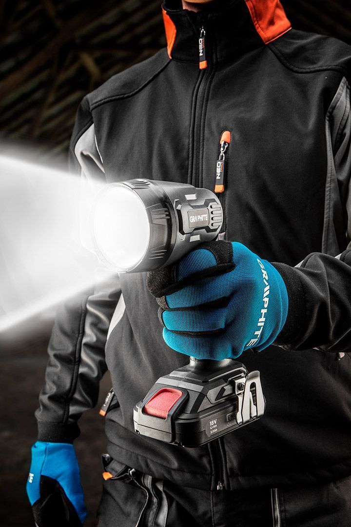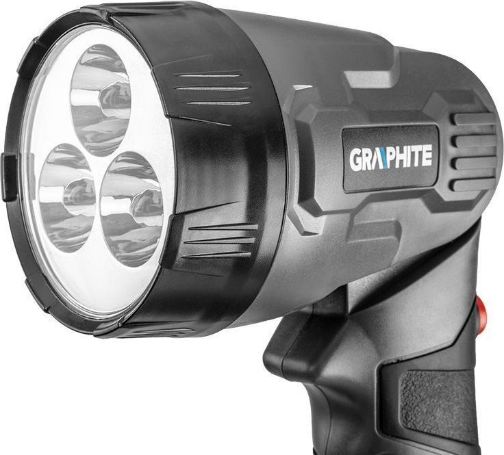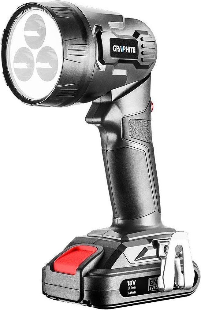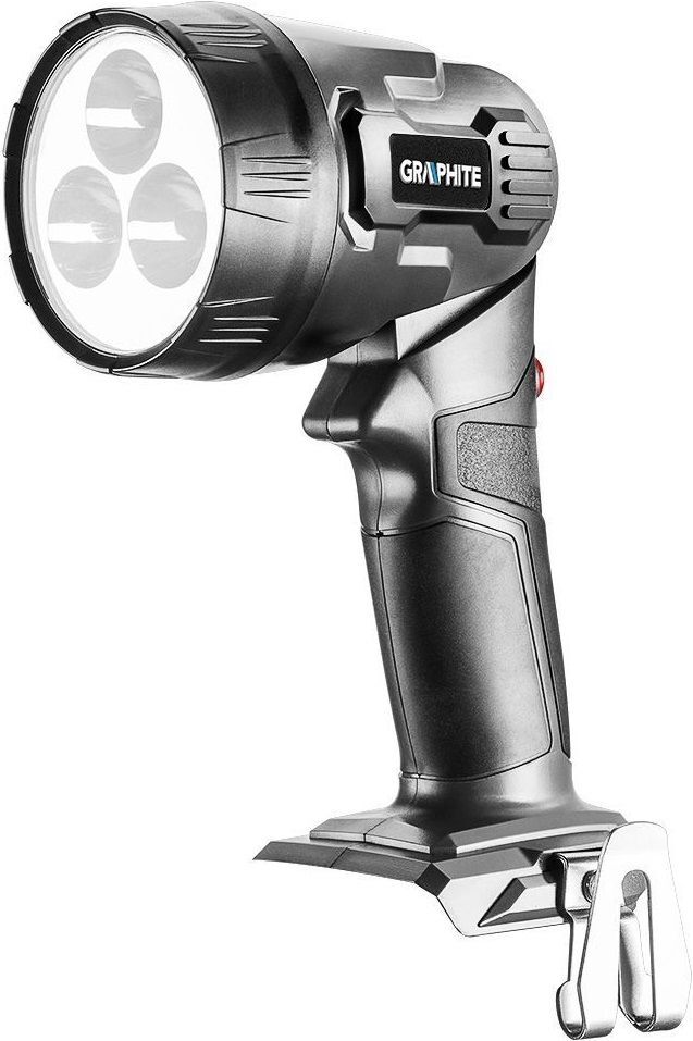 Ліхтар GRAPHITE обладнаний 3 високоякісними діодами LED, які випромінюють світло кольоровою температурою 7000 K. Діоди характеризуються широким кутом світіння 120° і потужним світловим потоком 260 Лм. У конструкції ліхтаря використано шарнір на 5 положень, який уможливлює налаштування падіння світла відносно виконуваному виду робіт. Ергономічне руків’я вкрите протиковзним пластиком, завдяки якому електроінструмент упевнено міститься у долоні. Ліхтар додатково обладнаний металевим гачком для чіпляння на пас. Сумісний з акумуляторами 18 В, Li-Ion, GRAPHITE Energy+.
