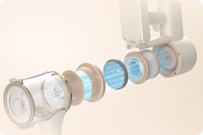 У конструкції фільтруючої системи застосовані відразу п'ять різних фільтрів, яке відмінно затримують все сміття, що всмоктується пилососом. Для уловлювання великих соринок використовується циклонний, конусний та попередній фільтри. Для утримування найдрібніших частинок застосовується решітка абсорбер та фільтр тонкого очищення. Система фільтрації вертикального пилососу Dreame R10 надійно затримує всмоктувану масу пилу та піщин в контейнері для збору сміття.