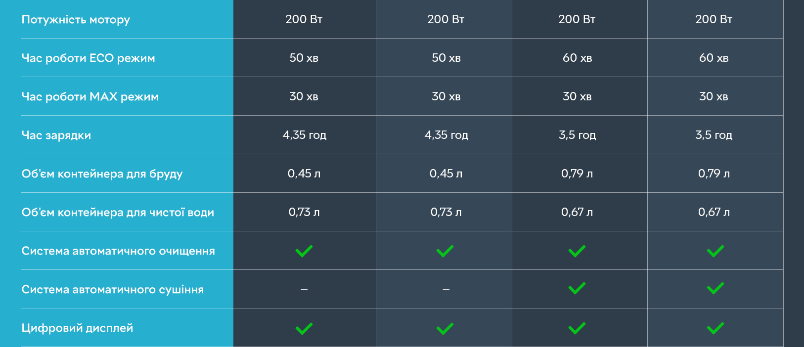 | Функції та можливості | Автоматичний режим, Безшумна робота, Вертикальна парковка, Самоочищення |