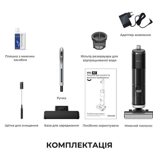 | Комплектація (можливі зміни в різних поставках) | Док-станція, Документація, Кабель живлення, Миючий засіб, Пилосос, Щітка для чищення |