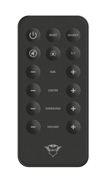 Бездротовий пульт дистанційного керування дозволяє змінювати гучність, освітлення, об'ємний звук динаміка, гучність сабвуфера і гучність центрального динаміка. Для цього не потрібно вставати зі стільця! На бічній панелі сабвуфера ви також можете включити/вимкнути акустичну систему, відрегулювати гучність і змінити джерело.
