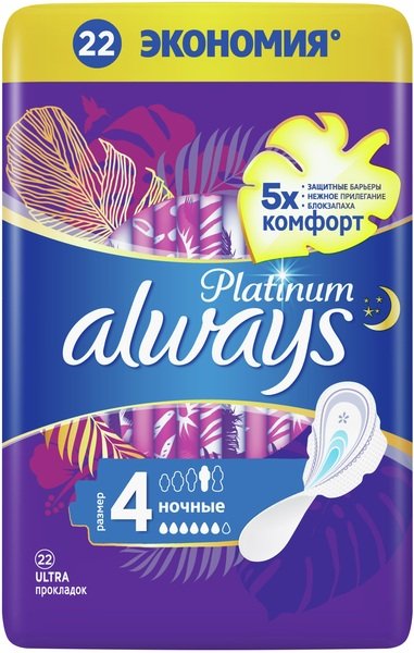 Рекомендовано використовувати прокладки Always Platinum Night (Розмір 4) з крильцями для використання впродовж нічного сну або вдень при рясних менструаціях.