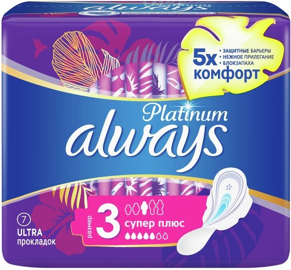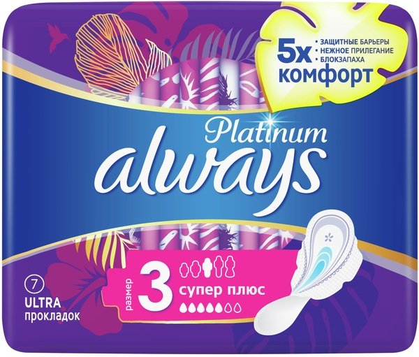 Гігієнічні прокладки Always Platinum забезпечують найкраще поєднання комфорту та захисту порівняно з іншими прокладками Always. Always Platinum забезпечують більший комфорт (у порівнянні з Always Ultra) завдяки тисячам мікроподушечок та новим шовковистим крильцям. Вони також забезпечують надійніший захист (у порівнянні з Always Ultra) завдяки захисним боковим бар'єрам та ультрапоглинальному внутрішньому шарові, який замикає вологу всередині. Рекомендовано використовувати прокладки Always Platinum Super Plus (Розмір 3) з крильцями для використання вдень при помірних менструаціях. Спробуйте Always Platinum Night (Розмір 4), найкращі гігієнічні прокладки для захисту впродовж нічного сну в лінійці Always Platinum.